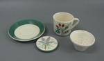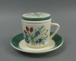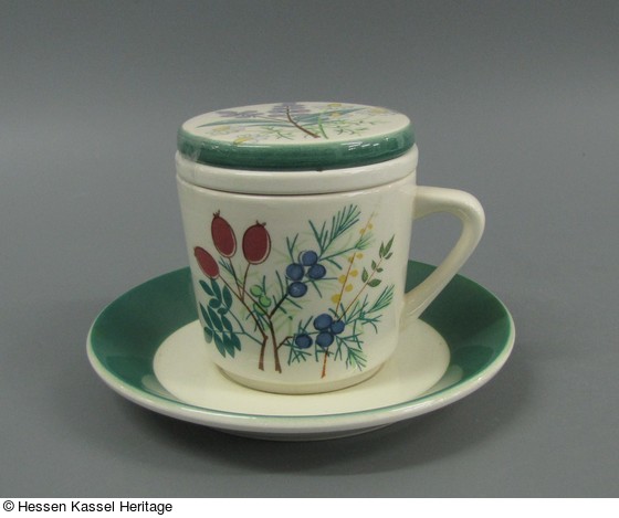 Steingut, glasiert, um Tasse, Deckel und Untertasse grüner Rand, Dekor Teepflanzen (Hagebutte, Kamille) und Fruchtstengel. |
