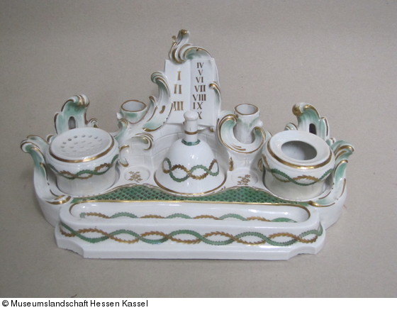 Schreibgarnitur mit Streusandbüchse, Tintenfass und Glocke |