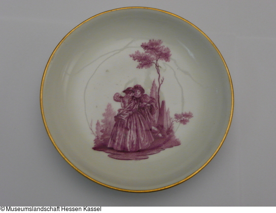 Porzellan, glasiert und bemalt (Aufglasur) mit Goldstaffage |
