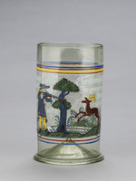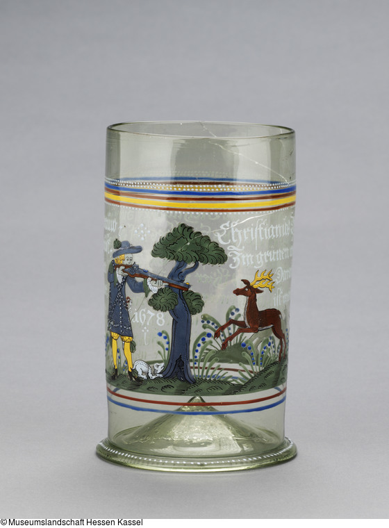 Der auf das Jahr 1678 datierte Waldglashumpen zeigt einen Jäger mit angelegter Radschlossbüchse beim Schuss auf einen kapitalen Hirsch, der ihm von einem Hund entgegen getrieben wird. Der Jäger wird von dem auf der Rückseite des Glashumpens angebrachten Gedicht als Förster Christian Gehebe, Förster und Tischmeister zu Lichtenau, identifiziert.