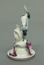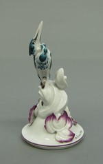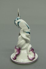 Vogel mit hochgerecktem Schnabel auf rundem gewölbtem Sockel, umgeben von drei Blättern und überwachsen mit Pflanzen