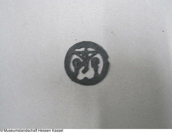 In Gottsbüren im Reinhardswald, Nordhessen, bildete sich 1331 eine Wallfahrt von europäischer Bedeutung heraus, als man eine Hostie mit Blutstropfen fand. Dieses Wunder sorgte einige Jahre für regen Pilgerzulauf. Mit Bezug zur Hostie zeigt das Pilgerzeichen den gekreuzigten Christus zwischen Maria und Johannes. In der Sammlung findet sich ein weiteres Gottsbürener Pilgerzeichen mit Maria und Johannes (KP 1972/44 (NT 369b).