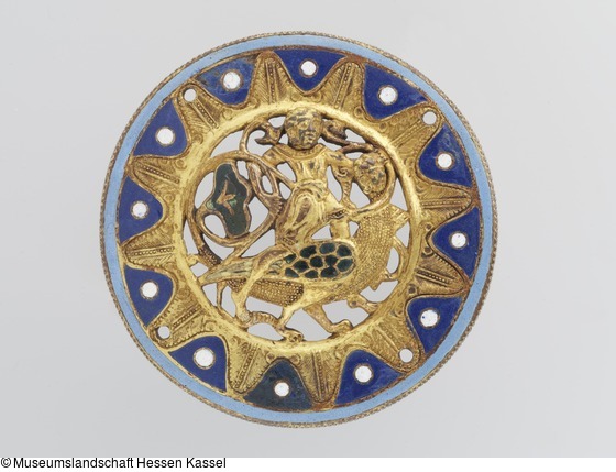 Das Medaillon dürfte einst als Beschlag ein Kästchen oder einen Koffer geziert haben. Dargestellt ist ein Jüngling, der mit einer Harpyie kämpft. Es handelt sich dabei um ein mythologisches Mischwesen aus Vogel und Mensch. Beschlagplatten dieser Art stellten die Werkstätten von Limoges seriell her.