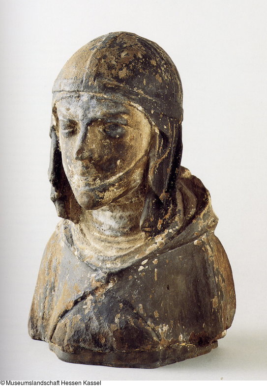 Die weibliche Büste in Ordenstracht stellt möglicherweise Gertrud (1227-1297) dar, die jüngste Tochter der hl. Elisabeth (1207-1231), Stammmutter der Dynastie der hessischen Landgrafen und Patronin des Landes Hessen. Gertrud war von 1248 bis 1297 Äbtissin des Klosters Altenberg bei Wetzlar und wurde 1348 heilig gesprochen. Die Büste fand man als Füllstein im Mauerwerk der Kirche des Franziskanerklosters in Fritzlar.