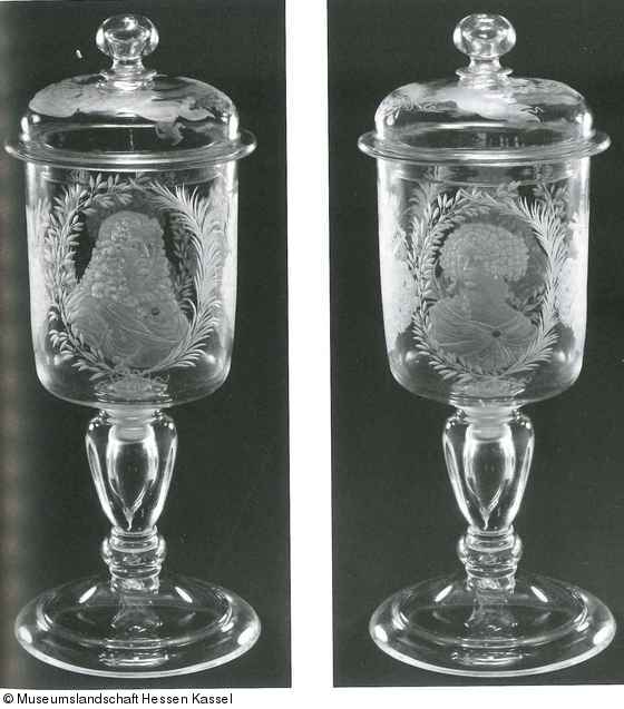 Der große Glaspokal trägt auf beiden Seiten der fast zylindrischen Kuppa von Lorbeer- und Palmzweigen umkränzte Porträts, die Landgraf Carl von Hessen-Kassel und seine Gemahlin Maria Amalia von Kurland darstellen. Der Deckel zeigt die von zwei geflügelten Putten getragene Fürstenkrone. Aufgrund der noch jugendlichen Erscheinung und Haartracht des Landgrafen gilt der Pokal als Werk aus der Zeit um 1680. Somit wäre er eines der ersten Kasseler Werke des 1679 an den landgräflichen Hof berufenen Künstlers. Ende des 18. Jahrhunderts besaß der Pokal noch einen hölzernen Fuß. Dieser wurde im 19. Jahrhundert durch den heutigen Fuß aus Glas ersetzt.