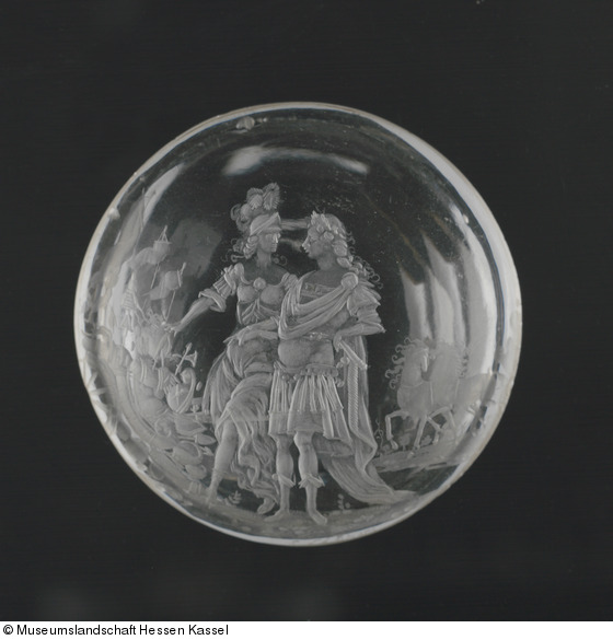 Auch der Deckel des Glasdöschens ist kunstvoll gestaltet. Landgraf Carl, nun mit dem Lorbeerkranz als Zeichen des Sieges bekrönt, wird von Minerva zu den Waffen und Standarten der Besiegten geführt. Die Figur der Minerva, hier als Personifikation der siegreichen Kriegsführung, war fester Bestandteil der frühneuzeitlichen Fürstenglorifikation. So findet sich die Göttin der Weisheit, des klugen Kriegswesens und des Handwerks, Schutzherrin der Wissenschaften und der Künste in den von Landgraf Carl beauftragen Werken in mannigfaltiger Gestalt. Denn mehr noch als den Halbgott und Helden Herkules bevorzugte der hessische Landesherr Minerva, als bildliche Verkörperung seines Selbstverständnisses als Herrscher.