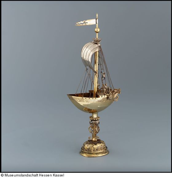 Später verbreiten sich Schiffspokale in fürstlichen und bürgerlichen Sammlungen. Reizvoll sind die Miniaturbesatzungen. Sie klettern Takelagen empor, feuern Kanonen ab oder wehren sich gegen Angreifer, in diesem Fall den Trinker.