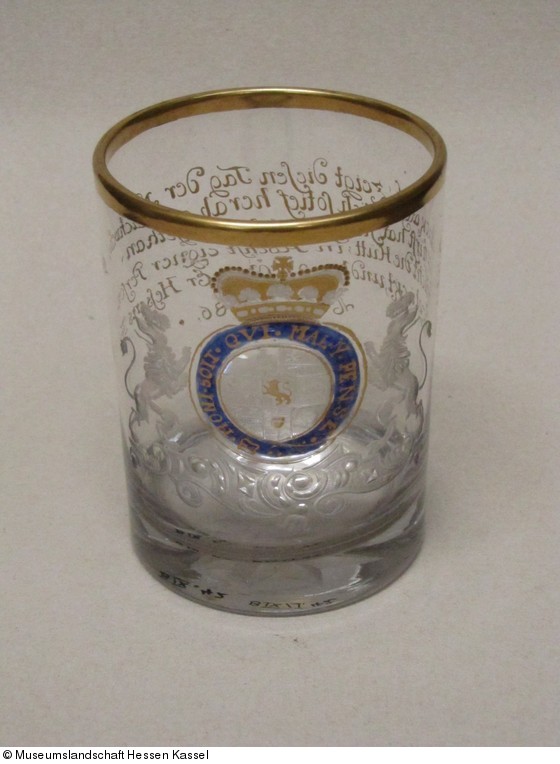 Der Becher entstand aus Anlass des Besuchs Landgraf Wihelms IX. von Hessen-Kassel in der Altmündener Glashütte. Darauf verweist sein Dekor: Das von zwei heraldischen Löwen präsentierte hessische Wappen auf der Vorderseite wird umrahmt vom englischen Hosenbandorden mit der Devise: "HONY SOIT QUI MAL Y PENSE". Wilhelm IX. hatte den englischen Orden am 2.6.1786 erhalten, woraus sich ein Terminus post quem für den fürstlichen Besuch und die Entstehung des Glases ergibt. Das Ereignis selbst wird in einer gereimten Inschrift auf der Rückseite des Bechers memoriert: