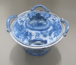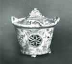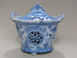 Potpourri mit Deckel, nach oben sich erweiternder Recipient mit drei Henkeln, Wandung von Rosetten durchbrochen, Dekor: Blumenstauden, Vögel und Insekten |