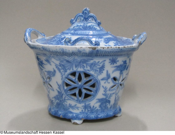 Potpourri mit Deckel, nach oben sich erweiternder Recipient mit drei Henkeln, Wandung von Rosetten durchbrochen, Dekor: Blumenstauden, Vögel und Insekten