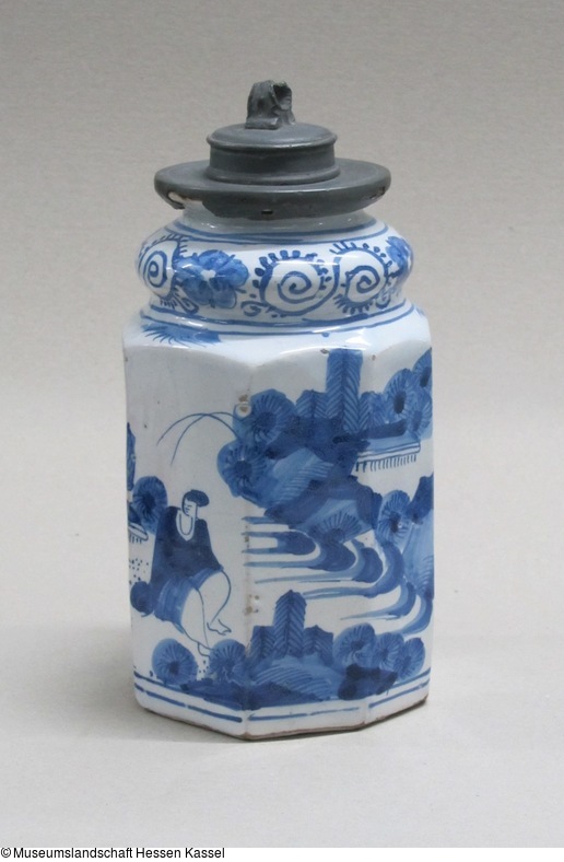 Fayence, glasiert und bemalt (Inglasur), Zinnmontierung |