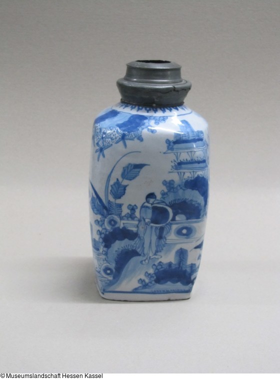 Material / Technik: Fayence, glasiert und bemalt (Inglasur), Zinnmontierung