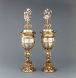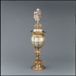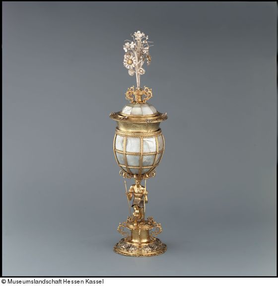 Perlmutt, die irisierende innere Schicht schalenbildender Mollusken (Weichtiere), wurde seit Ende des 16. Jh in Europa gehandelt. In Form von Plättchen kam es für Möbelintarsien, aber auch in der Dekoration von Pokalen zur Verwendung. Die beiden kostbaren Perlmutterpokale (s. a. KP B II.68) stammen aus dem Besitz Landgraf Wilhelms V.
