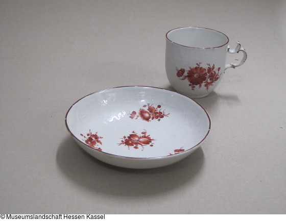 Tasse und Untertasse mit Blumenmalerei in Eisenrot |