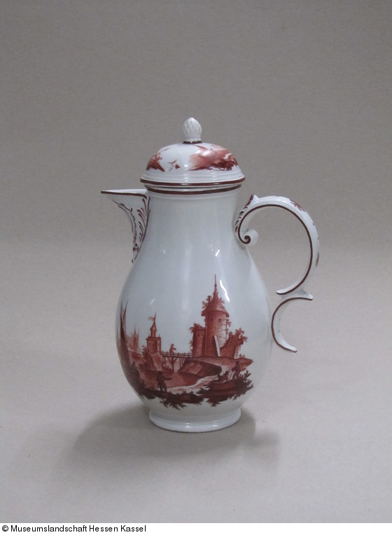 Kaffeekanne mit Fluß- und Ruinenlandschaft in Eisenrot |