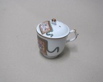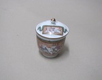 Deckeltasse mit Schreibutensilien in Medaillons auf holzfarbigem Grund (Quodlibet-Motiv) |