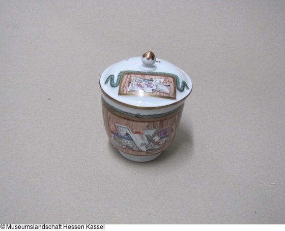 Deckeltasse mit Schreibutensilien in Medaillons auf holzfarbigem Grund (Quodlibet-Motiv)