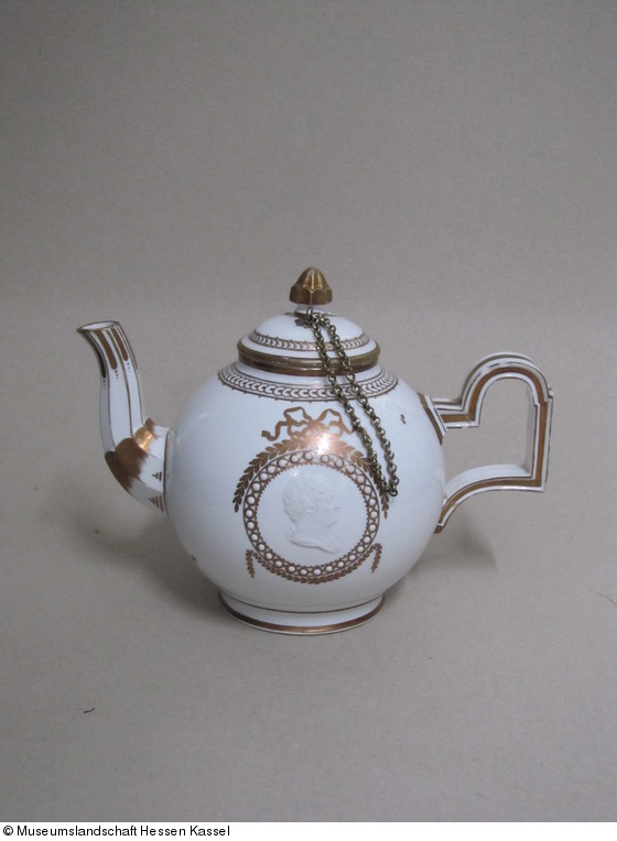 Porzellan, glasiert, mit Goldstaffage und Reliefdekor. Medaillons und aufgesetzte Punkte unglasiert. |
