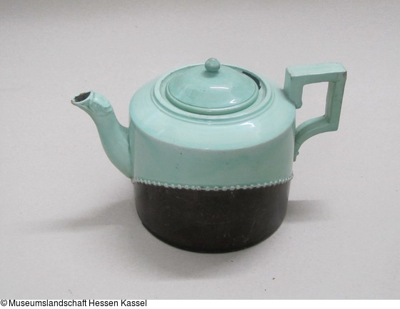 Hochgebranntes Steingut, schwarz und hellgrün glasiert mit aufgelegter Perlschnur. Wenige Reste von Vergoldung an der Perlschnur. |