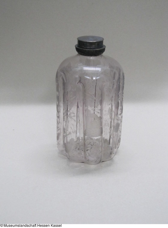 Achtbogige Flasche mit silbernen Verschlüssen und eingeschnittenen Tieren und Blumen