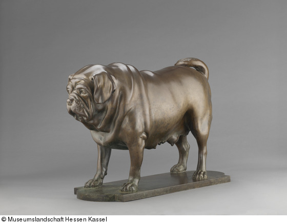 Bronze, Hohlguss, ziseliert; hellbraun, grün und grau patiniert; Aus der gleichen Form wie Mops 198, jedoch deutlich weniger fein ziseliert. |