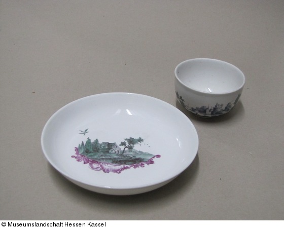 Tasse und Untertasse, Teile eines Services mit Ideallandschaften