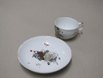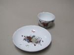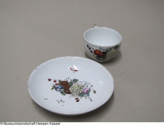 Tasse und Untertasse mit Blumen, Früchten und Hagebutten