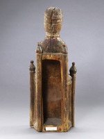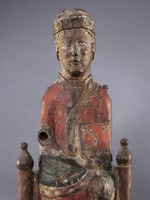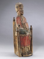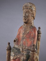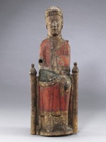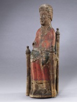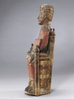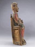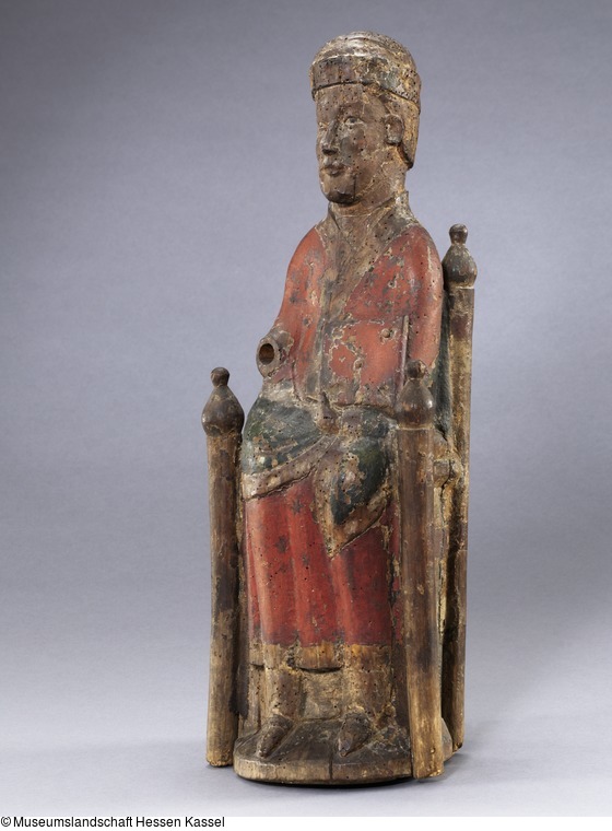 Der nicht näher identifizierbare Heilige auf Thronsessel stammt wie der Hl. Erzbischof (KP 1936/133) aus Fronhausen nahe Marburg. Aufgrund ihrer späteren Fassung aus dem 15. Jh. gleichen sie sich heute weitgehend. Es handelt sich jedoch bei dem Hl. Erzbischof um ein spätromanisches Bildwerk, das man zur Zeit der Gotik in Gestalt des Hl. Bischofs mit Kodex nachahmte.