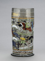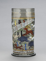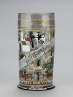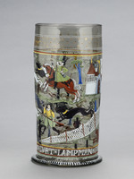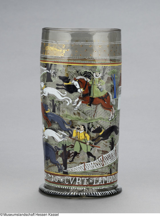 Darstellungen von Jagdszenen auf Emailgläsern sind keine Seltenheit. Durch den hohen Holzverbrauch der in den Wäldern liegenden Glashütten war es für die Hüttenmeister wichtig, sich das Wohlwollen der verantwortlichen und einflussreichen Forstbeamten zu sichern. So waren mit Jagdszenen bemalte Glashumpen beliebte Geschenke.