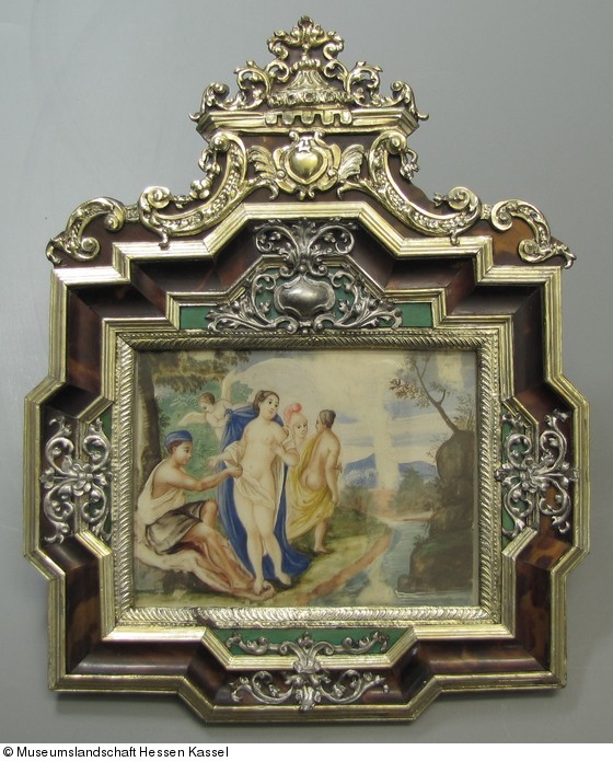 Silber, getrieben, teilvergoldet, Schildpatt, Elfenbein, grün gebeizt, Gouachemalerei, Holz |