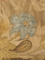 Spektakulär und in nur wenigen Beispielen erhalten ist der mit Goldfäden durchwirkte Seidenstoff vermutlich aus der Seidenmanufaktur Lyon. Sein persisch-indisches Muster war um 1705 topaktuell. Es trug solchen Geweben den Namen „bizzare Seide“ ein.