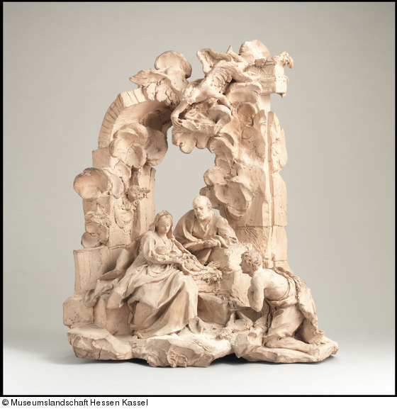 Der Bozzetto (ital. abbozzare: skizzieren, entwerfen) mit einer Darstellung der Geburt Christi diente vermutliche als erste Ideenskizze für eine Marmorgruppe gleichen Themas, die heute im Vorraum der Biblioteca Fabroniana in Pistoia ausgestellt ist. Agostino Cornacchini, ein in Pescia nahe Pistoia geborener Bildhauer, schuf beide Werke für seinen Landsmann und Protektor Kardinal Carlo Agostino Fabroni (1651-1727) in Rom. Die Marmorfassung der "Geburt Christi" sowie eine Skulpturengruppe der "Kreuzabnahme" zierten zunächst dessen römischen Palast, ehe sie mit seiner Bibliothek als Vermächtnis seine Heimatstadt Pistoia zurück gelangten.