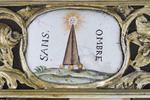 unter Fürstenhut: hSLh (auf der Schachseite rot und gelb, auf der Mühleseite blau; Emailmedaillon mit Spiegelmonogramm); Schachseite, oben: SANS. OMBRE (Emailmedaillon mit einer Pyramide/einem Obelisken auf drei Füßen, die von einer Sonne bekrönt wird); Schachseite, unten: A IAMAIS. (Emailmedaillon mit zwei ineinanderfassenden Händen, an Kordeln zwei Herzen); Mühleseite, oben: RIEN NE ME CHANGE GUE (sic!) LA MORT. (Emailmedaillon mit Darstellung einer Palme); Mühleseite, unten: CONSTANT.ET.FIDEL (Emailmedaill mit Darstellung einer behelmten Dame, die einen Fuß auf einen Klotz setzt und mit der rechten eine Säule umfasst. Zu ihrer Linken kommt ein Hund unter dem Kleid hervor); Auf vier der hellen Felder der Schachseite: "20", "15", "22", "17";