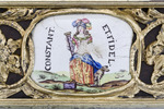 Den silbervergoldeten Rahmen der Schach- und Mühleseite zieren vier weitere Medaillons mit von Umschriften begleiteten Sinnbildern (Impresen). Auf der Schachseite sind dies zwei ineinandergreifende Hände, aus deren Verbund ineinander verschlungene Schnüre und zwei Herzen hervorkommen mit dem Motto „A IAMAIS“ (für immer) sowie ein Obelisk, auf dessen Spitze die Sonne zu sehen ist, mit der Umschrift „SANS OMBRE“ (ohne Schatten ). Auf der Mühleseite zeigen die Medaillons eine weibliche Figur mit Helm, einer Säule und einem Hündchen und der Umschrift „CONSTANT ET FIDEL“ (beständig und treu) sowie eine Palme mit der Umschrift „RIEN NE ME CHANGE CHE LA MORT“ (nichts verändert mich außer der Tod ). Alle Impresen variieren bekannte Motive der barocken Emblematik und haben Treue, Reinheit und Beständigkeit zum Thema.