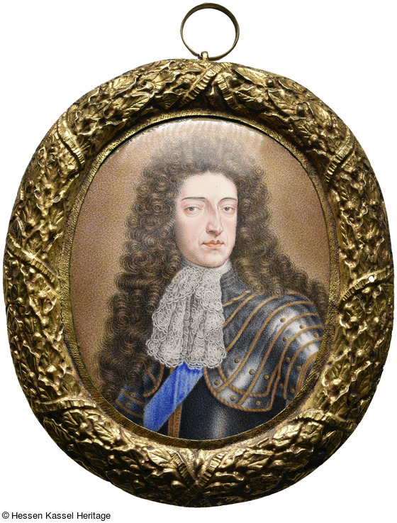 Das Miniaturmedaillon folgt einem Porträtstich König Williams III. von Gerard Valck, der seinerseits ein Gemälde des englischen Hofmalers Sir Godefrey Kneller rezipiert. In Abweichung von Valck lässt der Maler den Bruststern des Hosenbandordens weg und gibt nur das blaue Schulterband wieder.