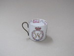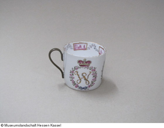 Porzellan, farbig bemalt, goldstaffiert. Tasse mit Messinghenkel. |