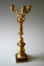 Standleuchter für drei Kerzenlichter mit quadratischer Plinthe, hoher Fuß mit Rauten- u. floralem Muster; über Blattrosette auf Kugel stehende Viktoria in antikisierendem Gewand, einen Kranz haltend. Aus diesem wachsen drei Leuchterarme mit Tüllen. Der feuervergoldete Leuchter bestehend aus 31 Einzelteilen einer Kupferlegierung.