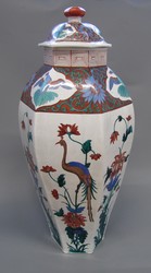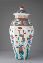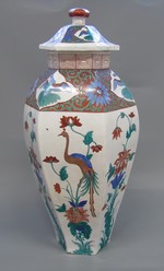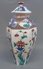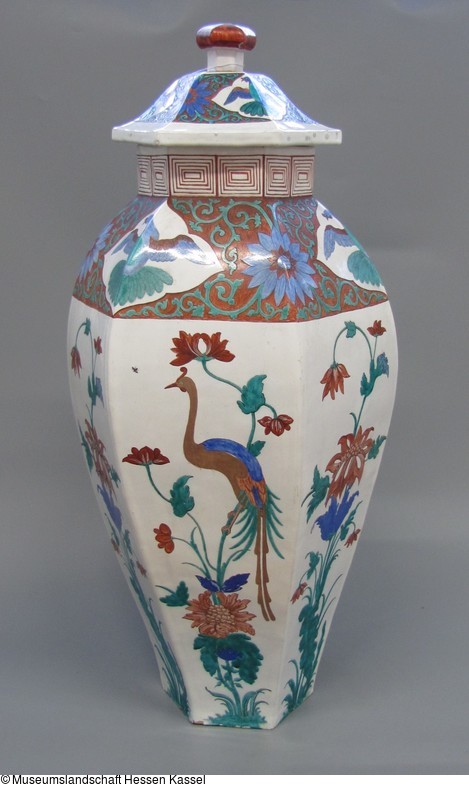Deckelvase auf sechseckigem Grundriss. In durchgehender Bewegung anschwingende Form mit kantig abgesetztem Kragen. Der Deckel zurückschwingend mit kantigem Stengel und leicht abgerundetem Knauf, in dessen oberer Rundung ein Loch ist. Tonmasse gelblich hell mit ganz leichtem Stich ins Rötliche. Dickfliessende, stellenweise ein wenig ins Grünlich spielende Glasur. Kräftige Bemalung in dünn aufsitzendem, glasierend aufgetragenem Eisenrot; blau und türkis in Emailfarben, in dem Türkis schwarze Innen- und Konturzeichnung. Das zuletzt aufgetragene Eisenrot stumpf. Hohe Felder, abwechselnd mit Blütenranken und phönixartigen Vögeln in den eben beschriebenen Farben und Goldbraun, eisenrote Blüten durch herausgekratztes Weiss modelliert.