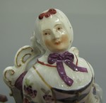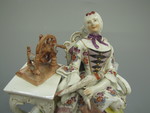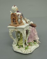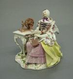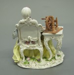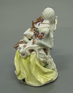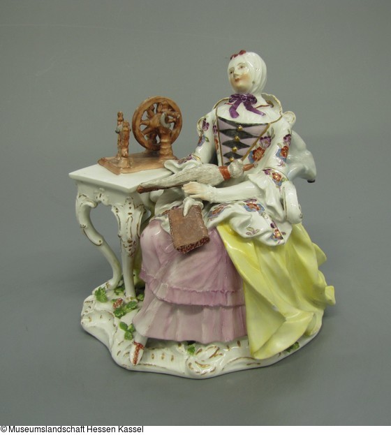 Spnnerin sitzend in Rokokosessel neben Tisch, der mit Handspinnrad bestellt ist. Auf dem Schoss Buch und Spinnrocken, weisse Schnürtaille mit buntem Blumendekor, gelber Reifrock und rosa Unterkleid, weisse Haube. Vergoldung des Tisches sehr dünn. Kissen hellbläulich-grau. Sockel mit Muschellaub. Marke: Meissen; nach Les amusements de la vie prive1efl