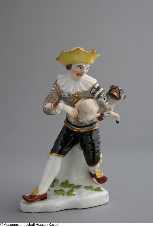 Ein Harlequin sitzt auf einem Baumstamm und schreit mit einem Mops um die Wette, den er unter dem linken Arm hält und dessen Schwanz er wie bei einer Drehorgel umleiert. Auf der linken Schulter ein Notenblatt mit der Überschrift ''Kehraus'' und der Unterschrift ?''da capot''? und zwei Zeilen Noten. Der Tierquäler trägt schwarze Kniehosen mit gelben Rüschen, rote Schuhe mit schwarzen Absätzen und gelben Rüschen, Jacke in ganz hellem durchsichtigen gelblich-grauen Stoff, belegt mit französischen Karten. Gelber Hut in einer chinesischen Achtecksform, darunter schwarzes Haar. Etwas Gold an Jacke und Hose. Der Mops sehr hell. Die Fussplatte mit grünen Blättern belegt.