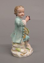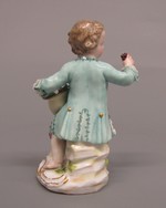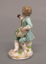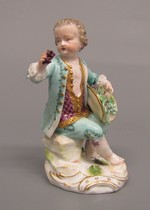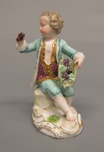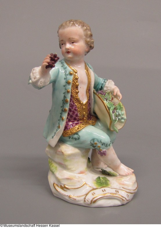 Knabe sitzend, in der rechten Hand Traube, auf dem linken Knie einen Hut mit Trauben gefüllt haltend. Grüner Rock mit Kniehose und goldgestickter roter Weste. Blick nach links gewandt.