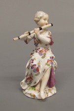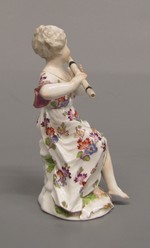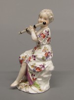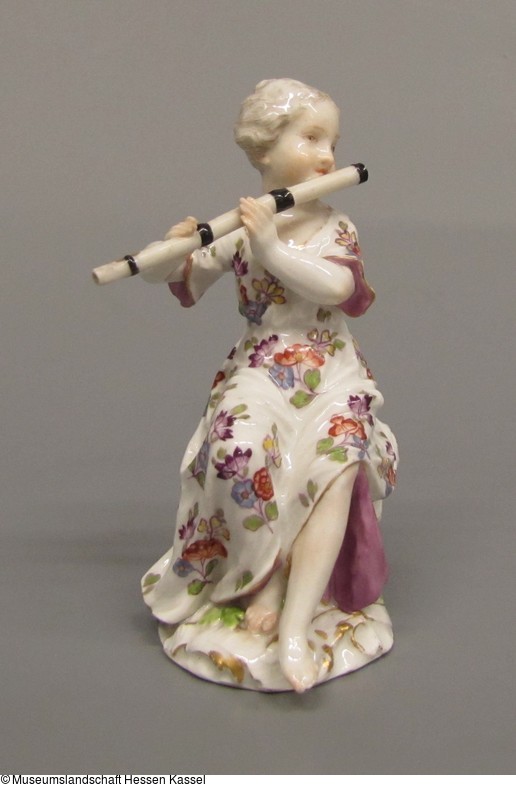Mädchen sitzend und Flöte blasend. Bunt geblümtes weisses Kleid. Sockelplatte mit Muscheldekor.