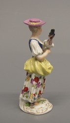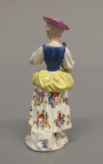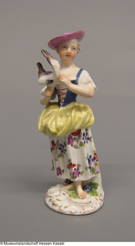 Auf einem rocaillengeschweiften Sockel mit Goldmalerei stehende Frau in bäuerlicher Kleidung, in ihrer Rechten ein Huhn haltend. Die Frau ist barfüßig und trägt einen weißen Rock mit indianischen Blumen, einen hochgerafften gelben Oberrock, ein blaues Schnürmieder mit weißer Bluse und einen purpurroten Hut mit gelbem Band und Schleife.
