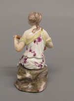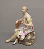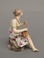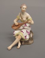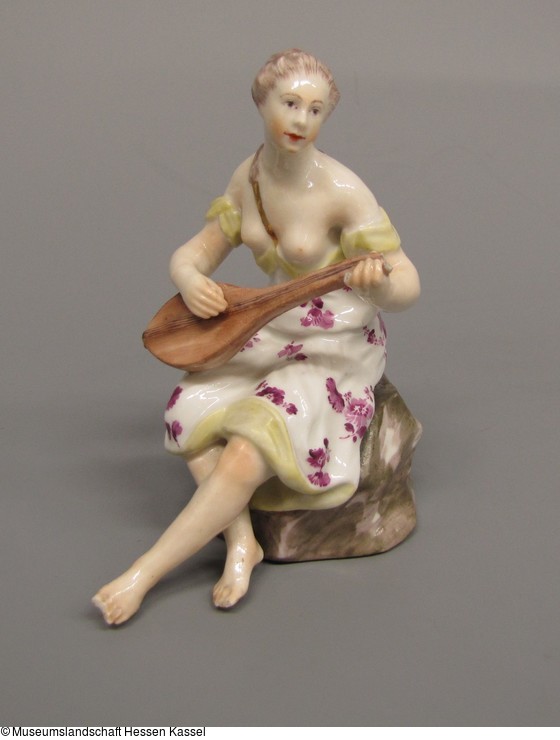 auf Felssockel mit übergeschlagenen Beinen, weit ausgeschnittenes Gewand mit Purpurblumen und gelbem Futter, auf einer Mandoline spielend.