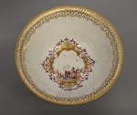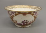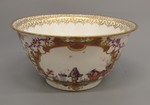 Dekor: Chinesenzenen mit Kartuschen und indianischen Blumen. Beste Hoeroldt-Malerei mit Goldlüster und Goldspitzenornament des Randes.