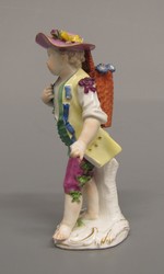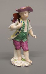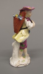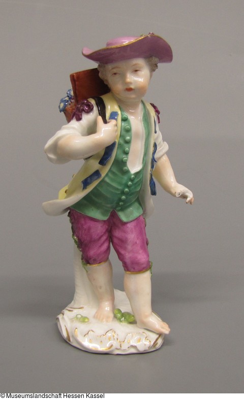 Knabe mit blumengefüllter Bütte auf dem Rücken, links vorschreitend. Zitronengelber Rock mit blauem Bandbesatz, grüne halboffene Weste und weinrote Kniehose. Hemd mit Purpurschleifen. Runder Hut, rosaviolett mit gelber Schleife. Flacher Sockel mit Muschellaubbelag.