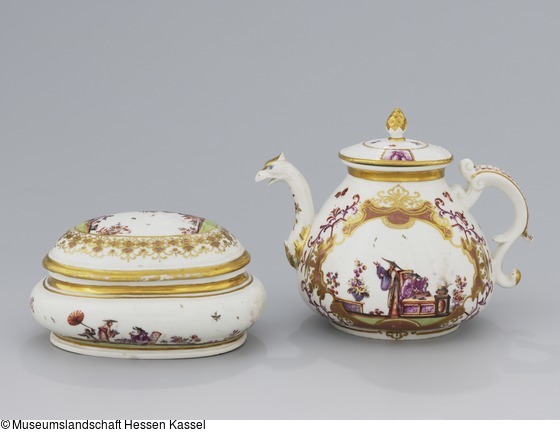 Dekor: Chinesenszenen in Kartuschen und indianische Blumen. Beste Heroldt-Malerei mit Goldlüster und Goldspitzenornament des Randes.