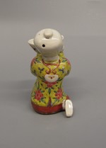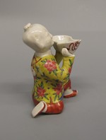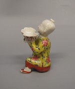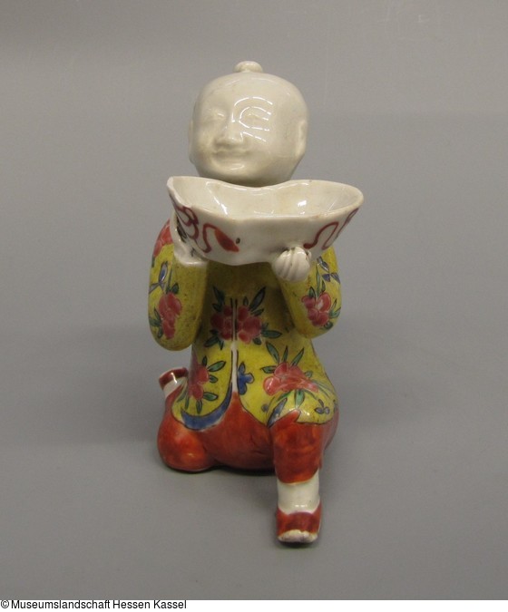 Das rechte Knie auf dem Boden, das linke Bein hochgestellt, in den Händen Schale. Bemalt in eisenrot unter Glasur und Emailfarben in grün, blau, rosa gelb und eisenrot über Glasur. Schwarze Konturen und Innenzeichnung.