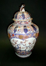 Typische Form der japanischen Deckelvase mit niedrigem Standring, gebauchtem Körper mit betonter Schulter, kurzem Hals, gewölbtem Deckel mit schmalem Rand und Fo-Hund als Knauf. Auf dem Standring das übliche eisenrote Spiralenornament. Darüber folgt auf eine blaue Doppellinie ein schmaler Dekorstreifen mit angeschnittenen Chrysanthemenblüten in Rot und Gold sowie blaue mohn-artige Blüten auf weißem Fond. Der größte Teil des Vasenkörpers ist in blauem Fond mit ausgesparten rot-goldenen Chrysanthemen und Blattwerk gehalten. Zwei große Fächerkartuschen auf der Vorder- und Rückseite lenken den Blick auf sich. Auf weißem Fond wachsen rotgoldene gefüllte Päonien mit blauem Blattwerk hinter einer Holzveranda mit blauem Geländer hervor. Das Pendant dazu ersetzt die Päonien durch blühende Prunuszweige. Eine einfache goldene und eine blaue Linie leiten über zu dem Schulterband. Auf weißem Fond liegen dicht nebeneinander unten abgerundete Streifen mit textilen Mustern, rote Swastika-Symbole und geometrische Motive neben rot-goldenen Blüten mit schmalen blauen Blättern und goldenem Blütendekor auf blauem Fond. Das Spiralornament des Standringes und das nachfolgende Chrysanthemenband schließen sich an. Der Deckel zeigt auf dem Rand das Chrysanthemenband, auf der Wölbung das Lamellenband der Schulter und wieder das Chrysanthemenband. Ein plastischer Fo-Hund dient als Knauf. Der Fo-Hund trägt die Farben Unterglasurblau, Braun-Aubergine und Eisenrot. Teil einer Garnitur aus drei Deckelvasen Inv.Nr. 4.1.1019 - 4.1.1021 und zwei Stangenvasen Inv.Nr. 4.1.935 - 4.1.936