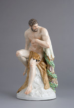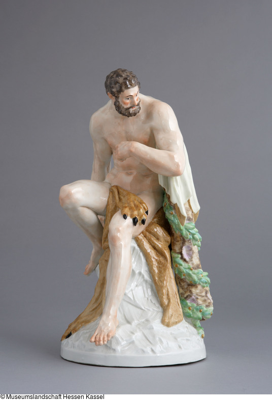 Felssockel, auf dem der nur mit dem Löwenfell bekleidete Herkules thront. Mit der Rechten hält er das umgeschlagene Fell, das unter der linken Achsel über die Keule gelegt ist. Die Keule ist mit Lorbeer umwunden. Farben: blass, wie in Berlin üblich. Der Sockel unbemalt. Das Löwenfell gegenständlich bräunlich gelb. Die Keule mit violetten Astlöchern, sonst bräunlich gescheckt. Lorbeergewinde mit goldenen Früchten.